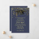 Black mortar cap and a golden confetti on a dark blue background Graduation Announcement flat card.