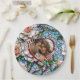 Personalized rehearsal dinner or wedding reception paper plates with bride and groom's initials, wedding date and photo. . A gorgeous illustration mimicking a stained glass and tiles mosaic of coral roses and with blue and other colourful accents.
