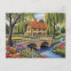 A beautiful mosaic-style house stands proudly at the edge of a winding stream, a little bridge arches gently over the flowing water, linking the house to a garden bursting with vibrant, blooming flowers in every shade.