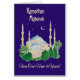 Carte de voeux Ramadan design "De notre maison à la vôtre" avec une mosquée éclairée par la lune sur un arrière - plan bleu profond, et "Ramadhan Moubarak" ; peinture à l'aquarelle de Judy Adamson.