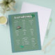 A simple yet lovely moss green chart with all kinds of aromatherapy hints listed. It tells you what aromas and essential oils to use for insomnia, insects stings and bites, depression, and six others. Includes basil, lemon, bergamot, tea tree, cinnamon, and many more. We offer this as a flyer, postcard and greeting card, so you can send it to your clients, and as a full sized poster.