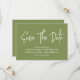 Modern calligraphy save the date in moss green colour with a digital scannable QR code for a website or contact information on the back.