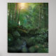Old growth forest with narrow stream running through moss covered boulders with soft sunlight breaking through the trees.