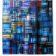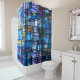 Modern art shower curtain with abstract design created from a digitally manipulated photograph of a stained glass window. The colours are mostly shades of blue but also include red, green and yellow.