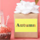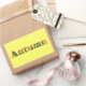 Une belle peinture de feuilles de bouleau d'automne est utilisée pour épeler le mot Automne, imprimé sur des autocollants. Peut être customisé.