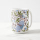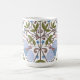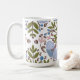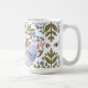 This ceramic mug features a hand drawn design of a delicate moth and floral designs in a beautiful corn blue and olive green shades.