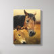 A beautiful quarter horse mother glances fondly at her baby colt. The peaceful equestrian scene has a muted backdrop of the pasture.