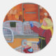 Original oil painting of a mother and child waving to giraffes at the Munich Zoo/Tierpark Hellabrunn. Artist, Susan Payne-Trutna 's original artwork is painted in warm colours and highlights the patterned tiles in the interior of the Byzantine style building housing giraffes. The mother is wearing a favourite red, green, and yellow Mondi coat from Munich.