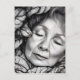 Postcard features an AI generated digital black & white illustration features a portrait of a beautiful exquisitely detailed sleeping old woman surrounded by leaves