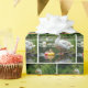 A serene scene depicts a white goose standing on the bank of a pond, watching over a gosling floating in a colourful inflatable ring