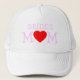 Mother of Bride Wedding Rehearsal Hat white and pink cap has a heart in place of the "O" in "MOM". Hat designates her special status during wedding rehearsal...and afterwards, too. Great, too, for wearing during informal, casual, beach or poolside weddings!