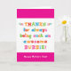 You call your grandmother Bubbie, not Grandma. (Bubbie means grandmother in Yiddish.) Imagine how excited Bubbie will be to receive a Mother's Day card addressed especially to her! Your bubbie also will love this card's fun, colourful text-based design that says "Thanks for always being such an awesome Bubbie! Happy Mother's Day!"