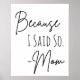 Mother's Day Gift Because I Said So Poster. Perfect gift for any special occasions.