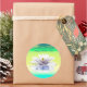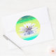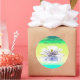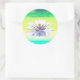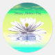 A sticker with my digital artwork in green and yellow of a white water lily on the water.