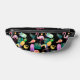 Un oiseau toucan, un flamant rose et un ananas lumineux se marient avec un cône de glace, des bars à crème glacée, une tranche de pamplemousse et un citron, avec des étoiles dorées et des feuilles de palmiers verts pour former un motif tropical amusant sur ce sac. Les images multicolores et lumineuses sont placées sur un arrière - plan noir dramatique. Votre monogramme à deux lettres est rose sur le dos. Lumineux, coloré et amusant !