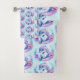 Serviette sertie d'une adorable illustration. Un dauphin bleu et violet entouré de jolies fleurs sous-marines colorées.