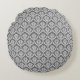 Coussin ronde décorative avec motif damassé gris.