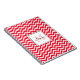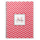 Le carnet en spirale personnalisé est doté d'un motif en chevron rouge avec un nom personnalisé en caractères d'écriture noire et d'un monogramme dans l'ombre rouge pastel en cadre carré blanc.