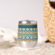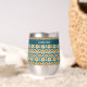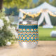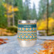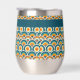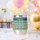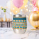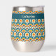 Ce verre à vin est de style bohème coloré, motif de cercles bleus, oranges et jaunes superposés. Votre nom, monogramme ou autre texte est en jaune pâle sur une bordure turquoise bleue. Style rétro !