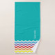 Serviettes de salle de bains personnalisées par motif turquoise à la mode de Chevron d'arc-en-ciel joli réglées. Amusement et arc-en-ciel brillamment coloré avec les rayures jaunes, oranges, rouges, pourpres, bleues et vertes de chevron sur un arrière - plan blanc et turquoise. Tween d'amusement, ado ou idées de cadeau d'enfants dans un thème d'arc-en-ciel. Personnalisé dans la police blanche sur la serviette de corps. Éditez pour changer le style de police. www.SamAnnDesigns.com