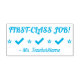 This inspiring rubber stamp design features the motivating message "FIRST-CLASS JOB!" and a custom educator's name. It could be used by a teacher, educator, or tutor when marking assignments, to acknowledge that a student has done well.