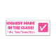 This motivating rubber stamp design features the encouraging message "HIGHEST MARK IN THE CLASS!" and a custom teacher name. It also features a decorative check mark icon. It could be used by a school teacher or educator when marking assignments, to acknowledge that the student has done well.