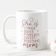 This simple design features the phrase, "She is strong, brave, fearless, lovely, beautiful, Mom." with cute star and sun accents. This coffee mug can be personalized with a name or initials. A great gift for that special woman in your life for any occasion!