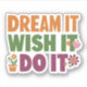 Stay motivated with our inspirational quote sticker: 'Dream It, Wish It, Do It.' This vinyl sticker is perfect for your laptop, water bottle, or planner, serving as a daily reminder to chase your dreams and take action. it’s a great addition to inspire positivity and productivity in your everyday life.