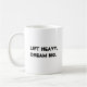 A mug with the motivating slogan "Lift heavy, dream big." in single font bold black text typography.