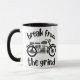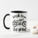 Une tasse à café avec une moto monochromatique rétro, avec l'expression "Break from the Grind" centrée autour de l'image. Le design laisse présager un sentiment d'aventure et de liberté, offrant une échappatoire paisible de la routine quotidienne.