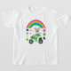 A cute dog on a motorcycle surrounded by a colourful rainbow and stars, design for children