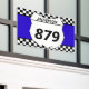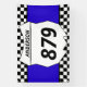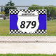 Tailgate in style at your next motocross race with personalized banner. This banner has a white number plate that's ready to be personalized with your name and bike number. The number plate is set against a bright blue background with a black and white chequered flag border.
