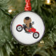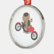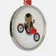 An adorable brown cat wears sun glasses and a retro biker outfit complete with leather vest and cap while he sits on a red motorcycle on an ornament.