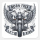 A detailed illustration showcases a motorcycle with prominent wings extending from its sides. The bike is positioned in the centre with a powerful presence, flanked by banners that read Born Free and Let's Ride. The design captures the spirit of adventure and freedom associated with motorcycle culture. Bold lines and intricate detailing emphasize the rugged aesthetics, making it a striking representation of a biker's passion for the open road.