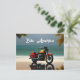 A beautiful motorcycle is parked on a beach under a cloudy blue sky.
