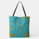 colorway turquoise et vert mousse. Mots qui signifient été : Brise tropicale, Bleu Cool et Lever de soleil Tequila combinés avec des images de Feuilles Monstera, Palmiers, Hibiscus et créer ce design graphique. Ce design se décline en trois coloris/designs différents. Les sacs de plage sont réversibles.