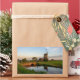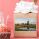 Colonne photo souvenir rectangulaire d'un moulin à vent à côté d'un petit fossé avec un pont au bord d'une grande prairie dans la campagne hollandaise au coucher du soleil à Aarlanderveen, la Pays-Bas.