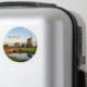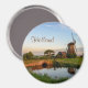 Aimant photo souvenir rond avec un moulin à vent à côté d'un petit fossé avec un pont au bord d'une grande prairie dans la campagne hollandaise au coucher du soleil à Aarlanderveen, la Pays-Bas avec le texte : 'Holland'.