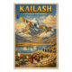 Travel poster featuring Mount Kailash, India, in a classic retro travel-poster style. Central focus on the sacred pyramid-shaped peak rising above pristine Tibetan plateau lakes and vast Himalayan plains, with prayer flags fluttering in the wind and pilgrims walking the kora path below. Soft golden sunrise light and drifting clouds create a deeply spiritual, timeless atmosphere. Harmonious color palette of snow white, sky blue, stone gray, and warm dawn gold. Clean graphic illustration with subtle vintage grain texture. Bold vintage typography headline: “KAILASH – CENTER OF THE WORLD”. Vertical 2:3 layout, high-resolution, print-ready.