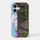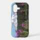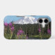 Protective and trendy phone case for the Apple iPhone that features a scenic photo image of snow capped Mount Rainier and pink Fireweed wildflowers along a lake shoreline in Mount Rainier National Park.