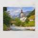 Photo postcard of a landscape with a church next to a mountain stream with in the background Alps mountains on a summer day in Ramsau bei Berchtesgaden in Bavaria, Germany, next to the border with Austria with a fading white bar and the text 'Germany'.