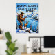 This captivating painting captures a moment of quiet contemplation between a rugged Sasquatch and a small deer fawn. The Sasquatch, wearing a cowboy hat and overalls, stands on a rocky, snow-covered outcrop, cradling the deer in his arms while gazing at a picturesque lake surrounded by mountains. The sky is a clear blue with gentle clouds, and the thick, textured impasto adds to the expressive nature of the painting. The witty phrase, "Bigfoot Doesn't Doesn't Believe You Either," is written in the sky, adding a touch of humour to the serene scene.
