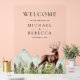 Amaze your guests with this elegant wedding welcome sign featuring a beautiful deer and rustic pine trees with mountains in the background.