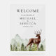 Amaze your guests with this elegant wedding welcome sign featuring a beautiful deer and rustic pine trees with mountains in the background.
