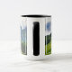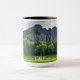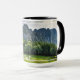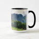 This mug features a picture of a mountain with a pine forest on a cloudy summer day in northern Italy
