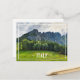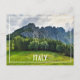 This postcard features a picture of a mountain with a pine forest on a cloudy summer day in northern Italy