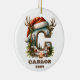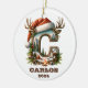 Celebrate the season's magic with this unique holiday ornament featuring the letter "C" decorated with a cozy winter landscape. Adorned with festive touches like a Santa hat and reindeer antlers, this ornament brings the outdoors inside with a scene of snowy mountains, pine trees, and a warm campfire. Personalized with a custom name and the year this ornament is a delightful keepsake for nature lovers and holiday enthusiasts. Perfect for those who cherish rustic decor with an adventurous twist, it adds a heartwarming touch to any Christmas tree.