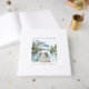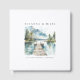 A mountain lake watercolor wedding guest book featuring evergreen trees, distant blue mountains, and a wooden dock extending across still water, symbolizing the journey you begin together. Designed for mountain, forest, lake house, and destination weddings, this elegant guest book creates a meaningful keepsake for friends and family to share their wishes and memories. The classic serif typography keeps the cover timeless and readable, while the soft watercolor landscape brings natural beauty to your welcome table. A beautiful heirloom piece that coordinates seamlessly with the matching invitation suite.