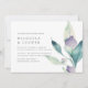 Our Mountain Meadow wedding invitation combines romantic watercolor florals with a simple layout and elegant lettering for a modern and minimal look. Design features your wedding details accented by a single oversized sprig of pale mint green and sage green watercolor botanical leaves and lavender purple flower buds.