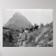 Four Native Americans Indians are on horseback on a cliff view of the mountain. Image is public domain from 1910-1920.